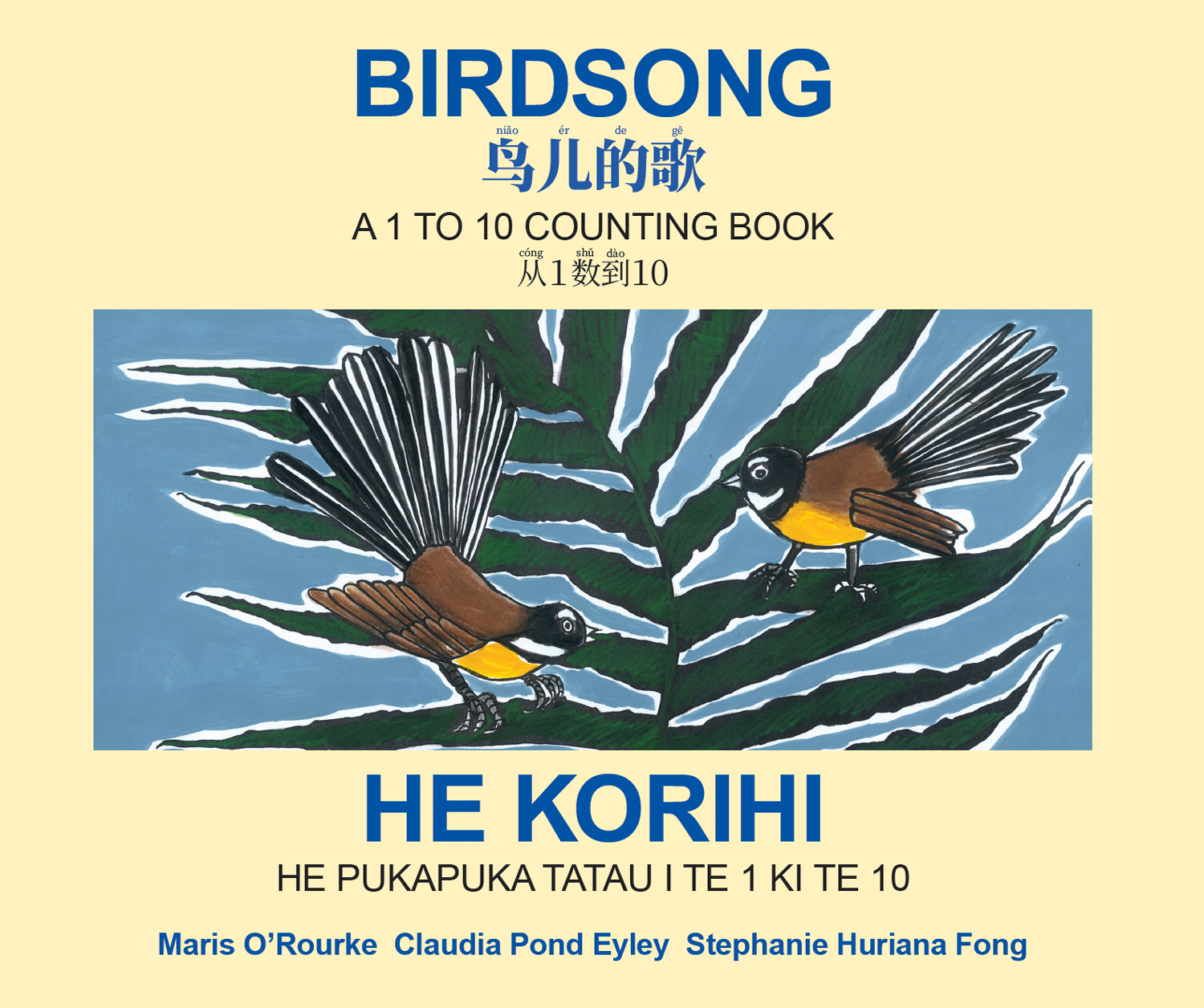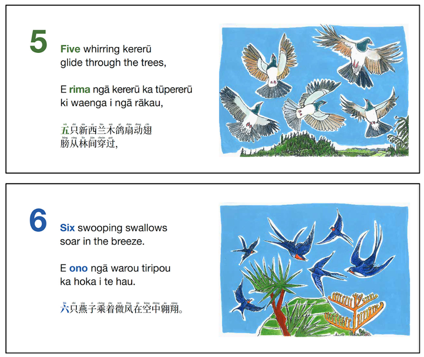 This edition of Birdsong / He Korihi is a charming trilingual, tricultural 1 to 10 counting book for 0–10-year-olds. It is beautifully illustrated with a mix of familiar native and introduced birds – just as Aotearoa has a mix of indigenous and immigrant peoples. The rhyming couplets introduce a range of interesting words and bird behaviours for readers and teachers. This classic picture book, now released in three languages, is published in association with New Zealand Chinese Language Week 2025.